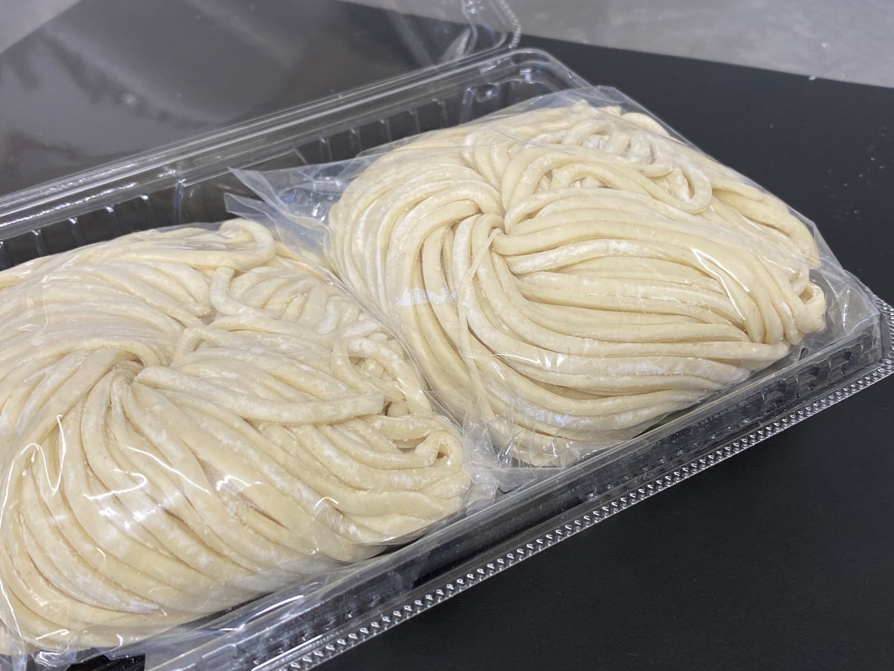 超多加水麺は半分の状態を軽く拗らせ麺が縮れないように冷凍しております。真空よりも少し軽い圧縮のため麺を潰さない加工をしております